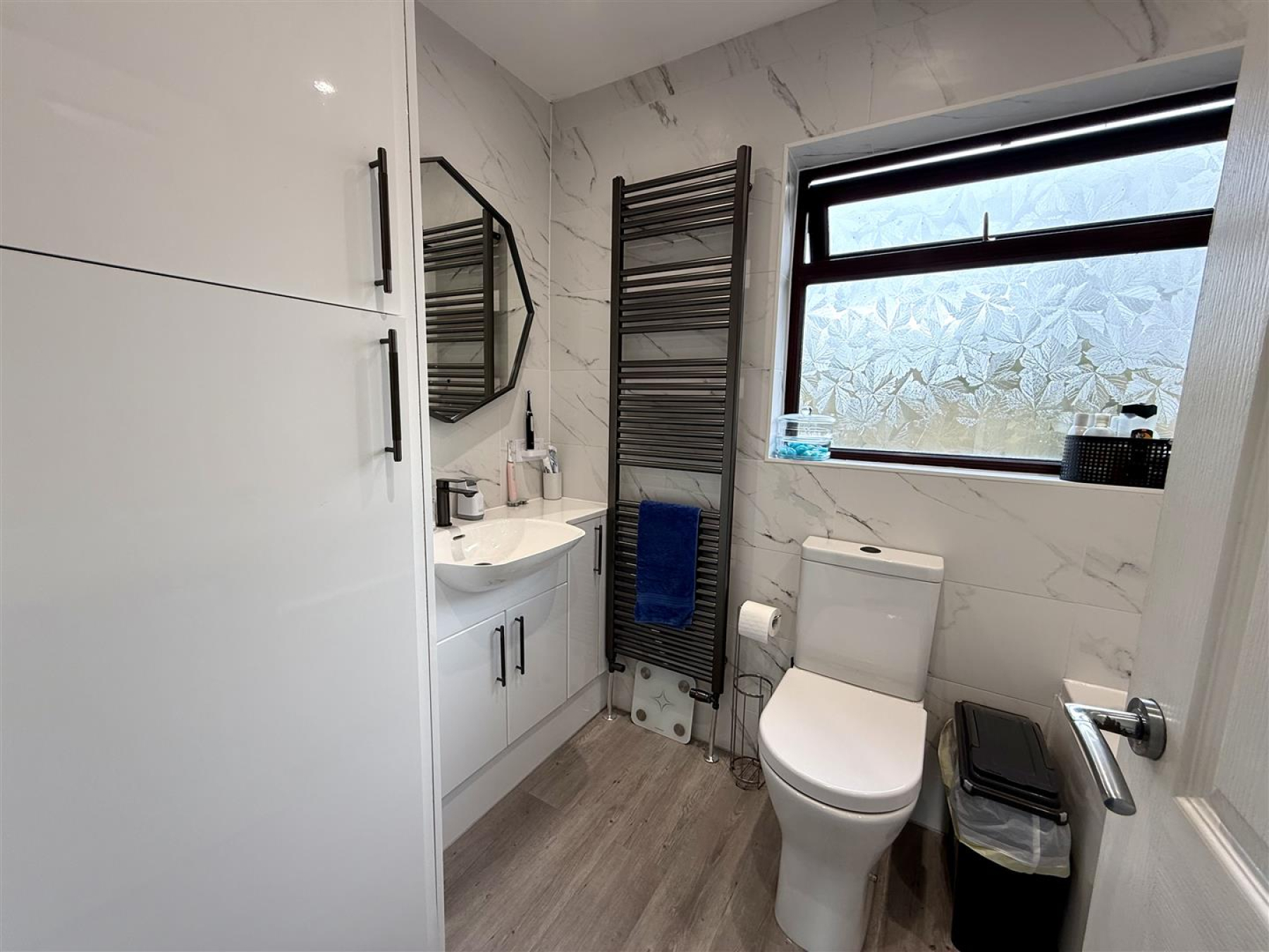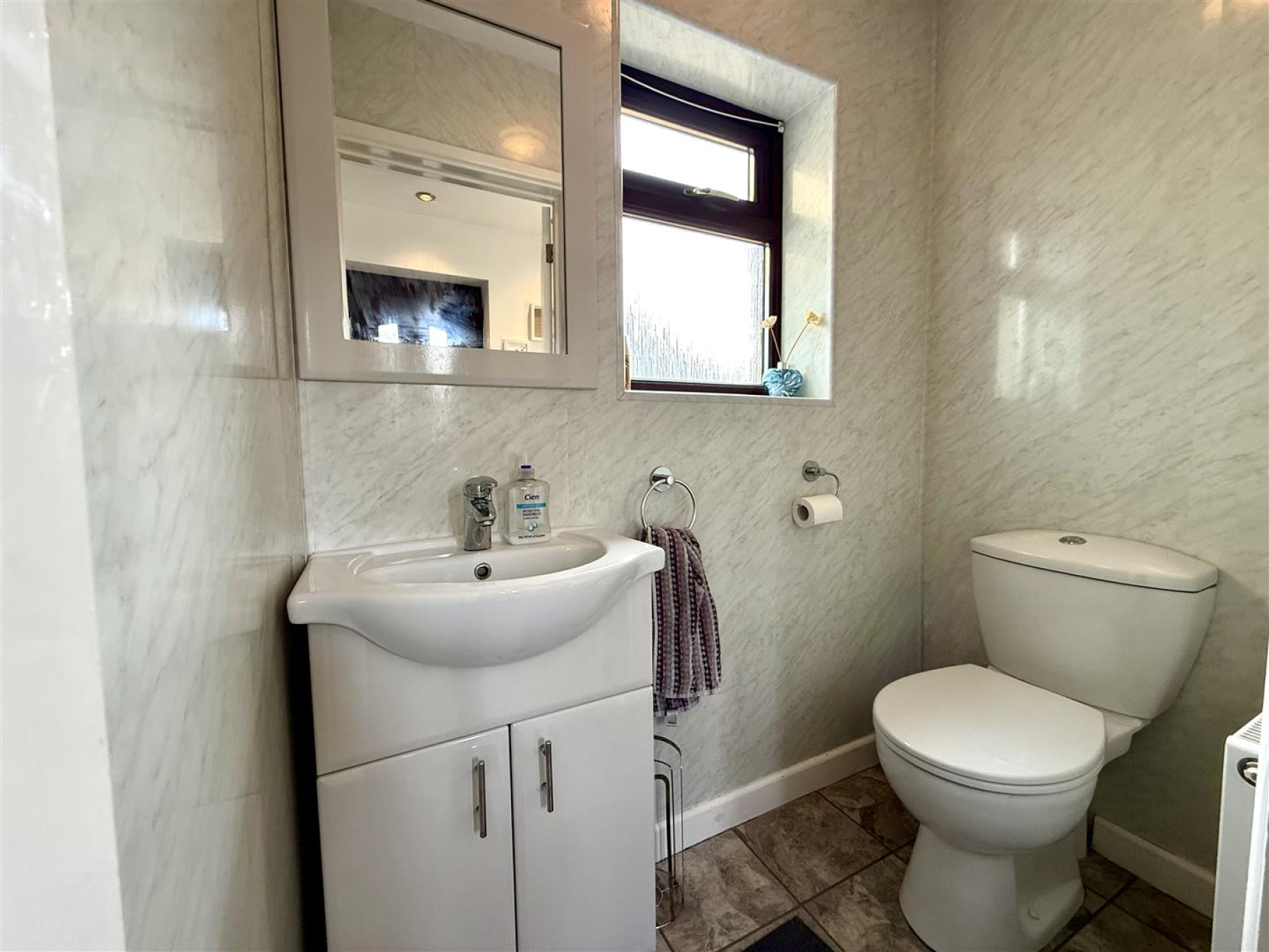 Cloakroom - 1.70m x 0.91m (5'6" x 2'11") - Low level WC. Hand basin with chrome mixer tap on vanity cupboard. Respatex panel wallets. Ceramic tiled floor. Radiator.