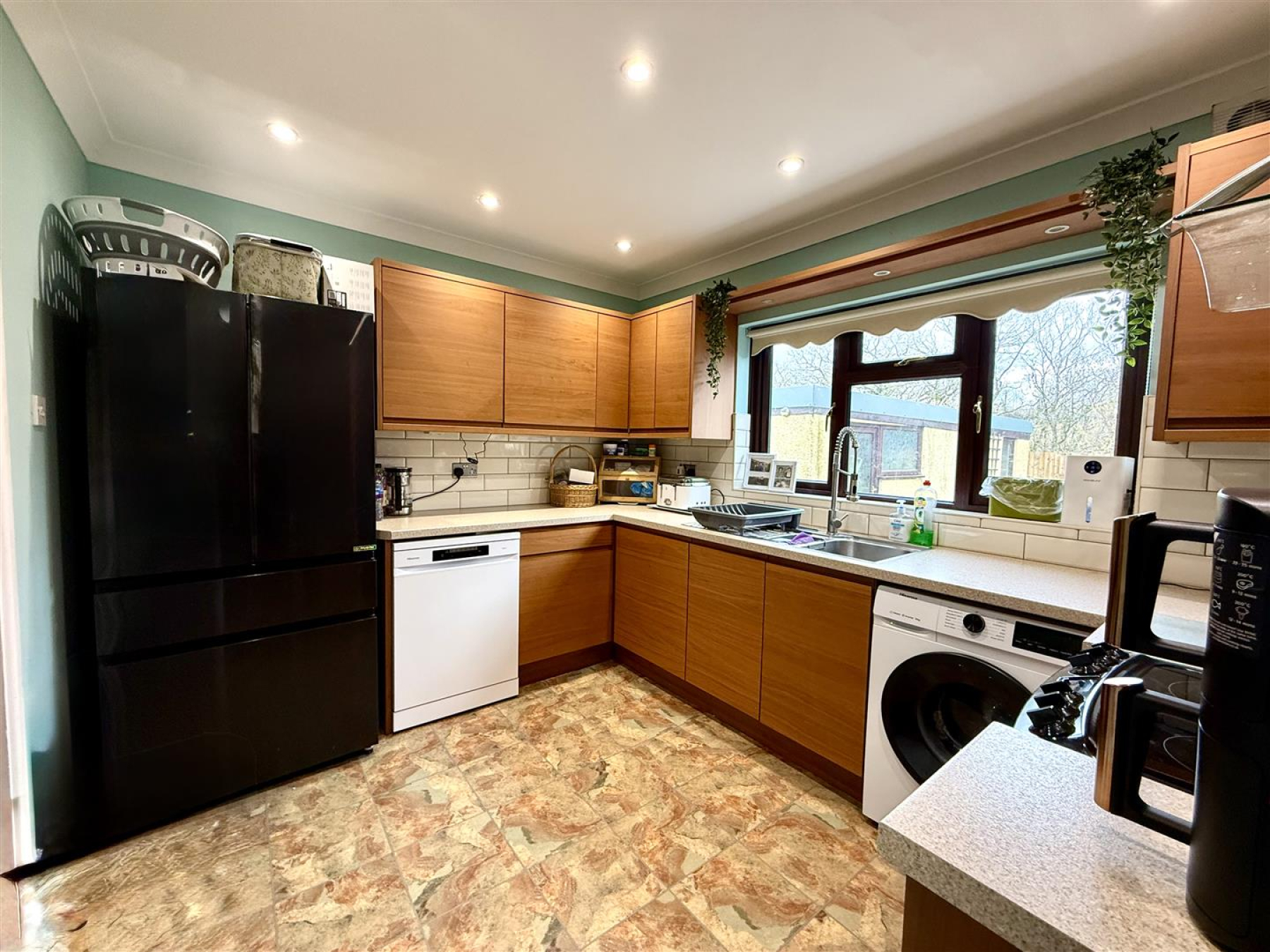 Kitchen/Breakfast Room - 3.32m x 2.79m (10'10" x 9'1") - 1 1/2 bowl stainless steel sink unit with mixer tap set in granite effect work surface with attractive tiled surround. Plumbed for automatic washing machine and dishwasher. AEG electric stove with stainless steel extractor hood above. Fitted range base and wall cupboards. Ceiling downlighting. Stone effect tiled floor. Radiator.