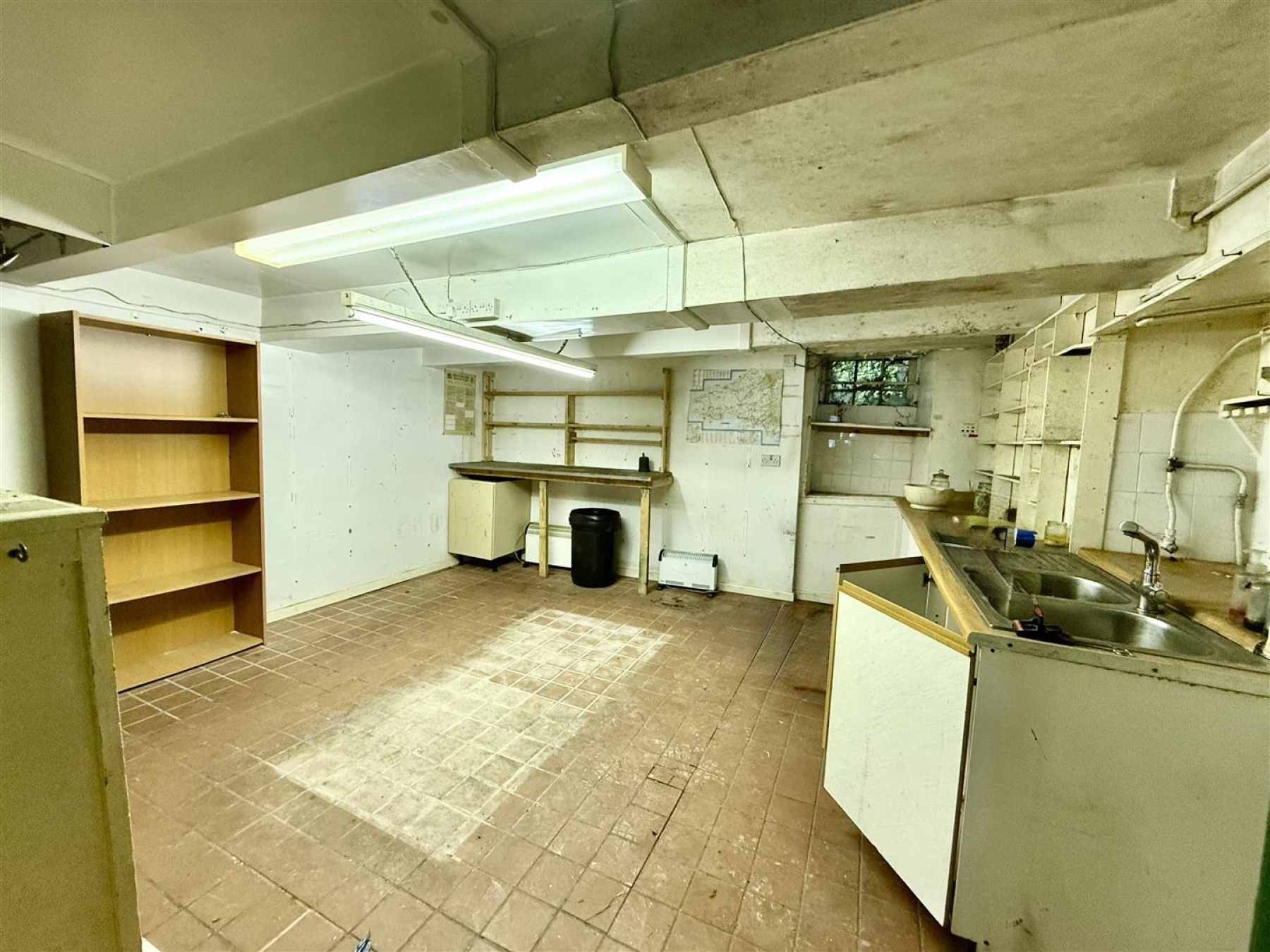 Rear Reception Room - 4.39m x 4.37m - Double bowl stainless steel sink unit with mixer tap. Extensive fitted wall shelves, base cupboards and work-surface. Quarry tiled floor.
