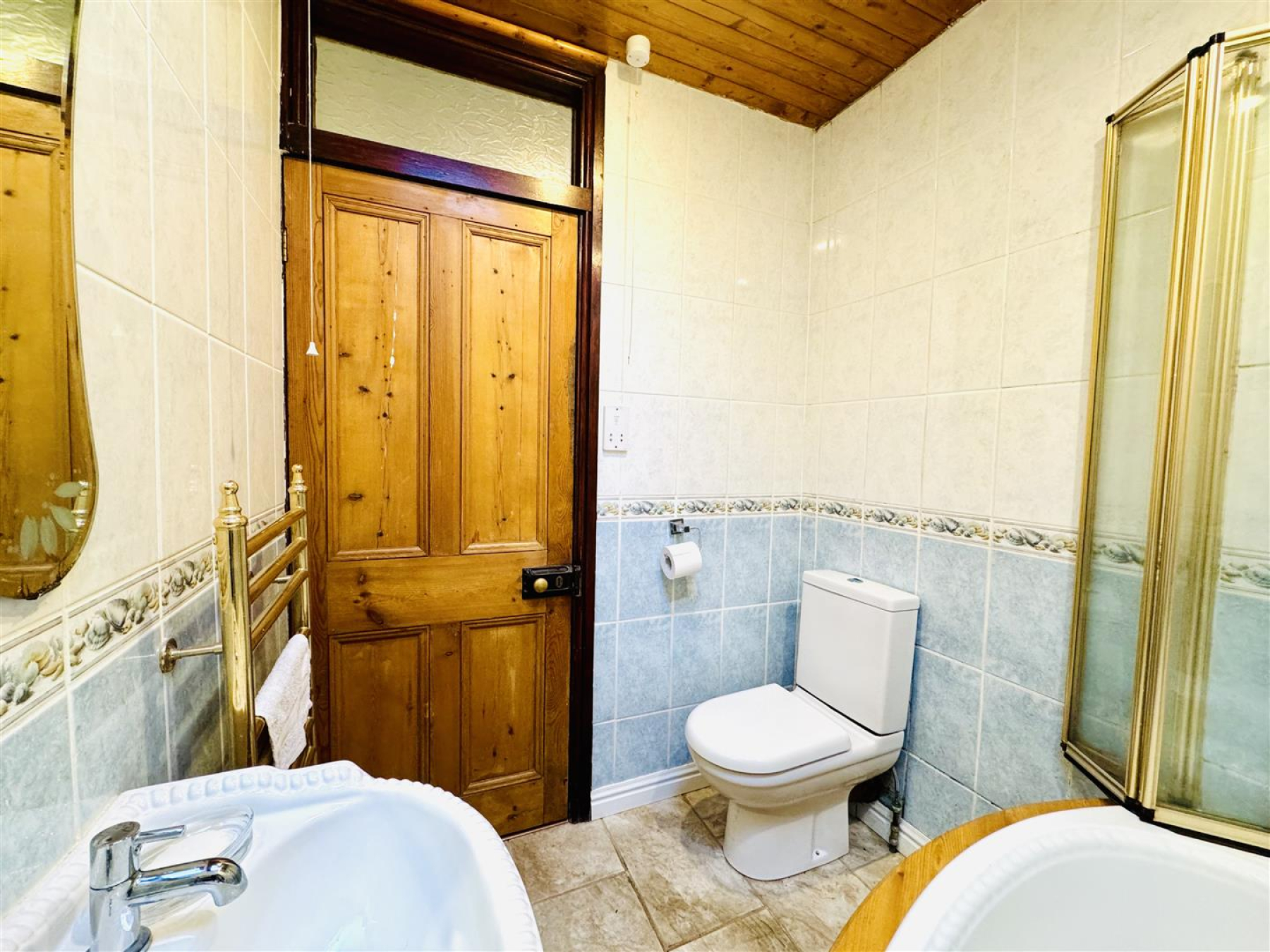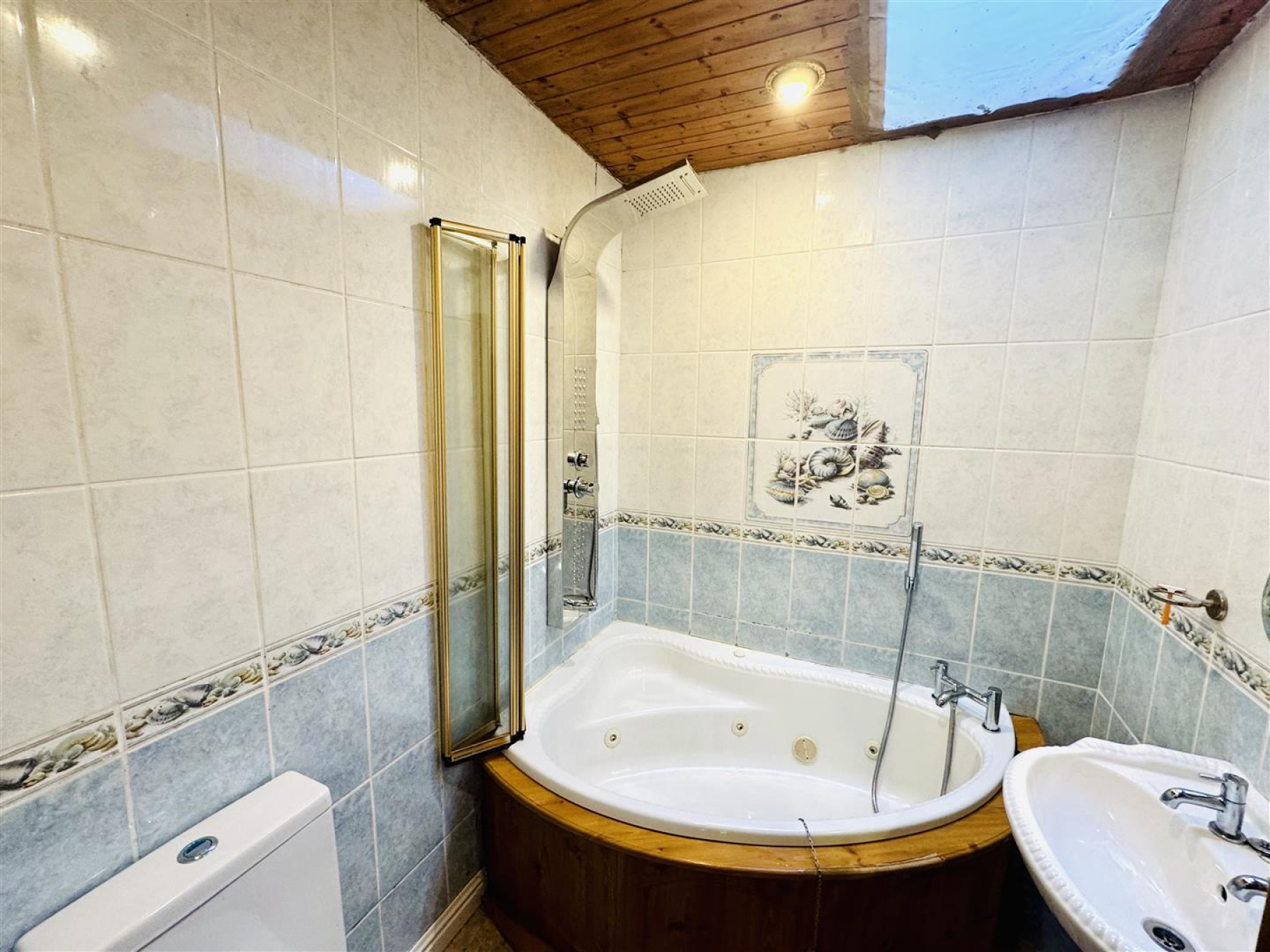 Bathroom - 1.97m x 1.70m (6'5" x 5'6") - Corner panelled whirlpool bath with shower above and glazed surround. Pedestal hand basin. Low level WC. Ceiling skylight. Fully tiled walls. Tiled floor. Heated towel rail.