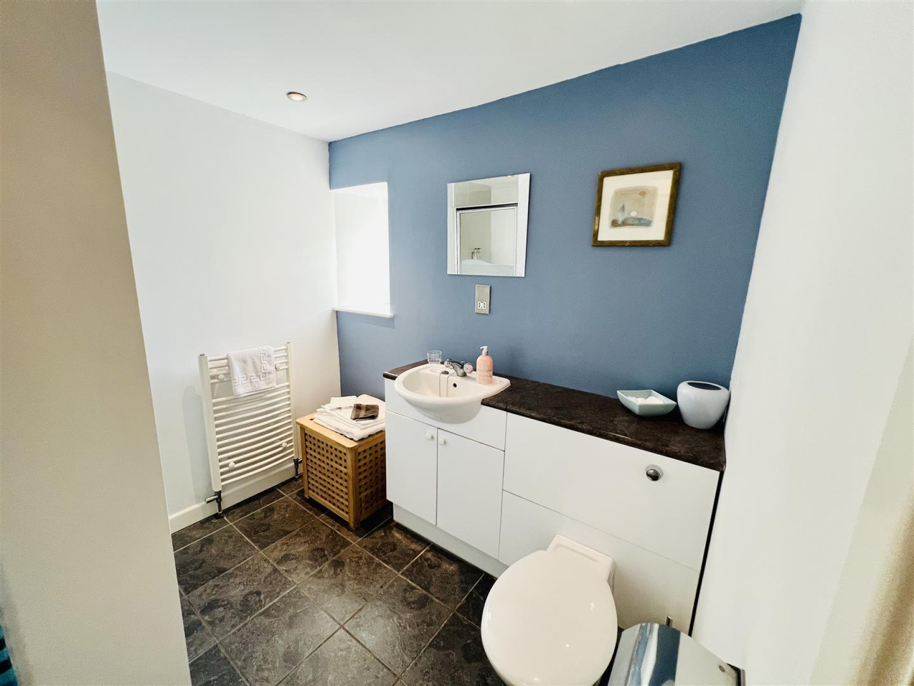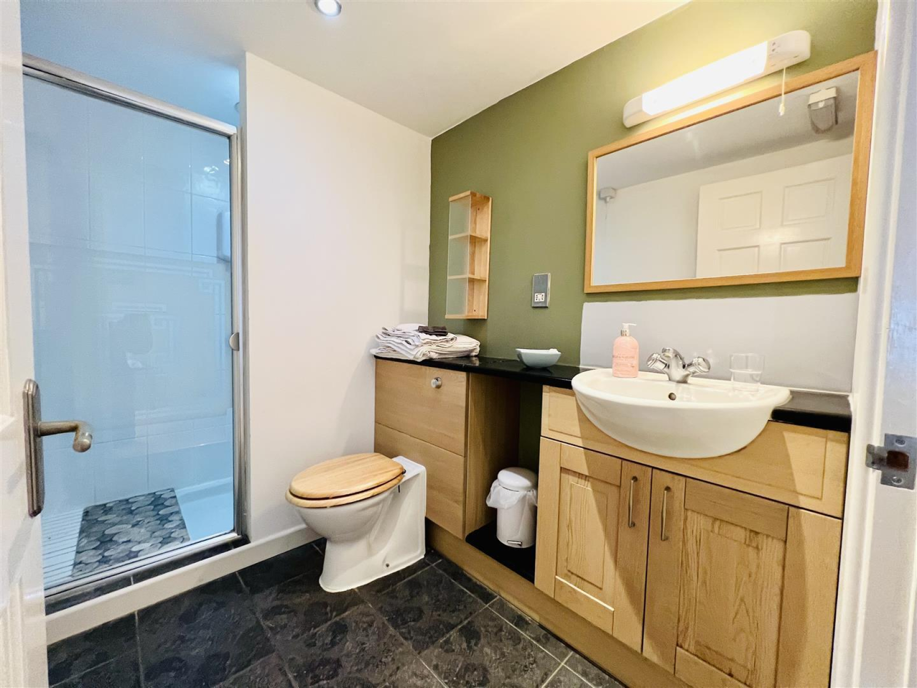 Shower Room - 2.53 x 2.0 - Mira sports shower in tiled and glazed cubicle. Hand basin on vanity with chrome mixer tap and tiled splash back. Low level w.c. Stone effect tiled floor. Ceiling down lighters. Chrome towel heater.